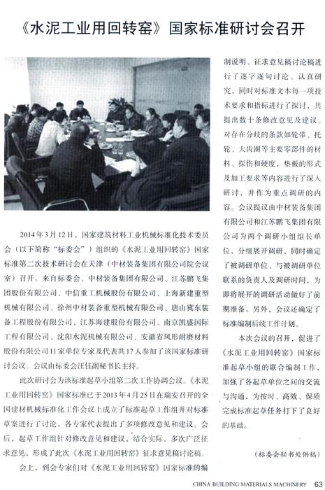 2014年3月12日,國家建筑材料工業機械標準化技術委員會組織的國家標準第二次技術研討會在天津召開。江蘇鵬飛集團股份有限公司等11家單位專家及代表共17人參加了該國家標準研討會議。