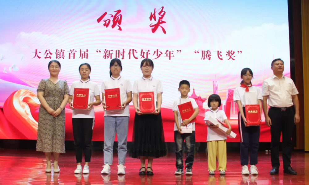 海安市委宣傳部未成年人思想道德建設(shè)科科長奚海寧、大公鎮(zhèn)人大主席王軍共同為大公鎮(zhèn)首屆“新時(shí)代好少年”“騰飛獎(jiǎng)”獲得者頒獎(jiǎng),并送上禮品。