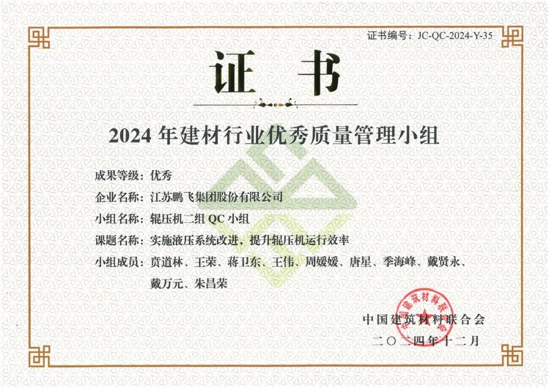 鵬飛輥壓機二組QC小組的課題“實施液壓系統(tǒng)改進,提升輥壓機運行效率”榮獲2024年建材行業(yè)優(yōu)秀質(zhì)量管理小組優(yōu)秀成果,輥壓機二組QC小組榮獲“我最喜愛的質(zhì)量管理小組”。
