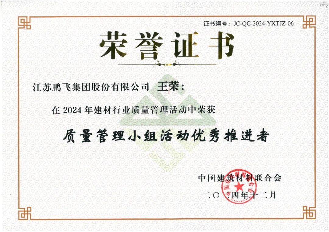 鵬飛集團衷心感謝中國建筑材料聯(lián)合會搭建的寶貴平臺。此次榮獲多項榮譽,是對我們長期堅持質(zhì)量為本、創(chuàng)新驅(qū)動戰(zhàn)略的充分肯定。這些成果離不開每一個QC小組的精益求精、一線員工的辛勤付出,以及像王榮同志這樣的優(yōu)秀推進者的不懈努力。這份榮譽將激勵我們繼續(xù)深耕質(zhì)量管理工作,追求卓越。
