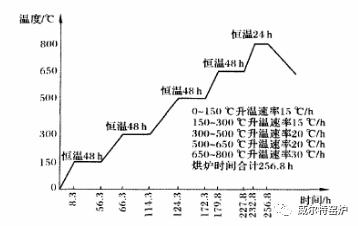 第一個溫度點是150℃。此溫度點主要是完成砌體中游離水的蒸發。因為水在100℃時變為水蒸氣,但蒸發不快,故必須大于100℃時才能有效干燥。根據經驗選150℃為宜,此階段脫水量不大,不能太快。如果水分排出太快,內部殘存水分擴散速度趕不上表面蒸發速度,內部水會受熱變成蒸汽產生膨脹致使泥漿收縮發生龜裂,降低粘接強度,削弱砌體強度,澆注料更是如此。因此,由常溫至150℃的過程中,升溫不能太快,控制在10℃·h-1為宜,當達到150℃時,還必須保溫一段時間,保證砌體充分干燥。