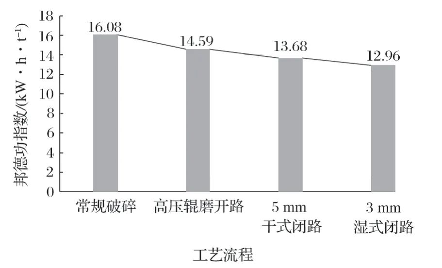 (2) 通過 3 種工藝流程產品功指數測定分析發現,不同粒度閉路流程不僅影響產品粒度,還影響產品球磨邦德功指數,3 mm 濕式閉路比 5 mm 干式閉路功指數降低 0.72 個百分點,可進一步改善礦石可磨性,降低一段磨礦能耗。