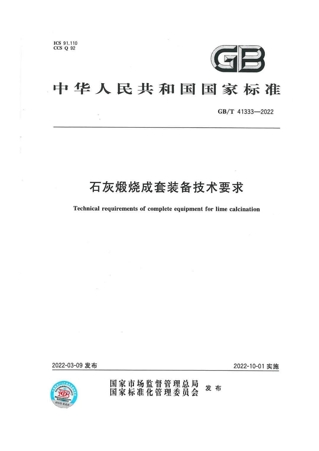石灰行業《石灰煅燒成套裝備技術要求》(GB/T 41333-2022)最新標準于2022年3月9日正式發布,并將于2022年10月1日起實施。