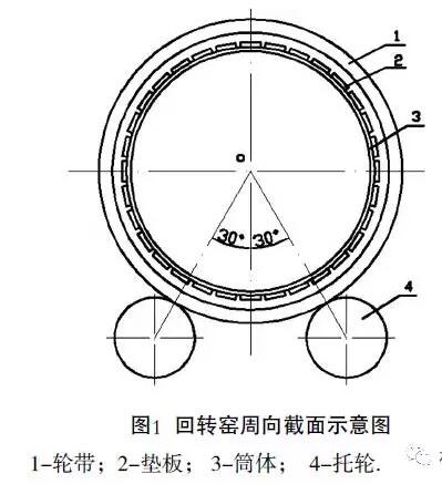 我公司生產(chǎn)的回轉(zhuǎn)窯采用浮動(dòng)輪帶支撐窯筒體,輪帶是實(shí)心矩形斷面活套套在筒體上,加固窯筒體,見(jiàn)圖1。輪帶與筒體之間均勻分布著32塊墊板,避免輪帶內(nèi)表面與筒體外表面直接接觸。圖2為浮動(dòng)輪帶與墊板結(jié)構(gòu)示意圖。表1為Ⅲ檔原墊板 的主要尺寸及塊數(shù)。在回轉(zhuǎn)窯運(yùn)轉(zhuǎn)過(guò)程中,筒體、輪帶和墊板之間留有一定的間隙。表2為輪帶內(nèi)徑與墊板外徑之間的間隙,這樣必然引起輪帶與筒體墊板之間產(chǎn)生滾動(dòng)和滑移。我公司生產(chǎn)的回轉(zhuǎn)窯已運(yùn)轉(zhuǎn)僅年,墊板與輪帶內(nèi)圈均有不同程度的磨損,使輪帶起不到加固筒體作用,造成筒體橫截面變形增大,同時(shí)輪帶和墊板之間產(chǎn)生很大滑移,已超過(guò)極限值,致使限制輪帶軸向竄動(dòng)的壓條頻繁被推掉。