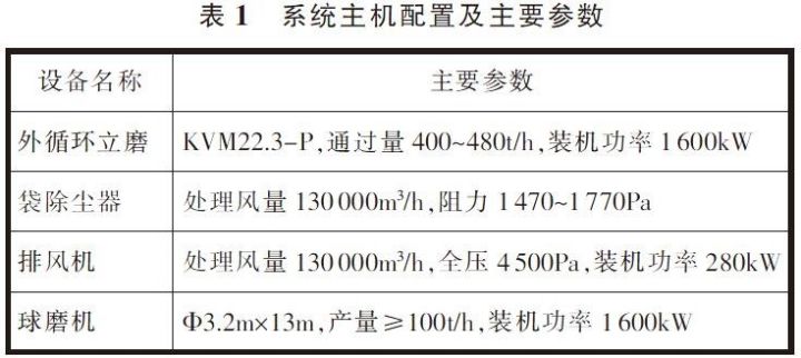 改造后的系統(tǒng)主機(jī)配置及主要參數(shù)見表1,系統(tǒng)工藝流程見圖1。該系統(tǒng)與其他立磨組成的聯(lián)合粉磨系統(tǒng)相比,主要在于立磨本身的高效粉磨特殊設(shè)計(jì),另外,選粉系統(tǒng)采取高料氣比設(shè)計(jì)與操作(實(shí)際操作中V型選粉機(jī)的料氣比達(dá)5.5m3/h),實(shí)現(xiàn)選粉系統(tǒng)的最大節(jié)能化,并控制合理的入球磨機(jī)物料粒度(確保最大顆粒小于1mm),并根據(jù)入磨物料的粒度分布對球磨機(jī)進(jìn)行技術(shù)改造,達(dá)到系統(tǒng)提產(chǎn)降耗的目的。