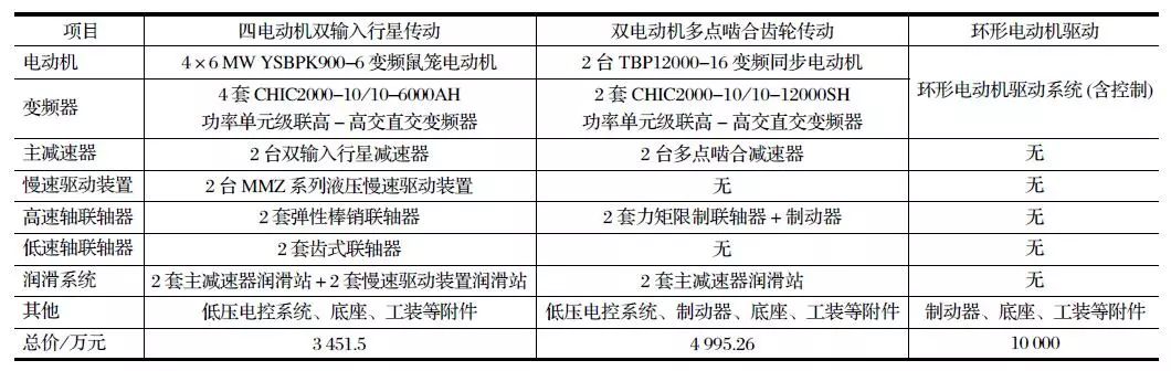 表 2 φ12.2 m×8.8 m 半自磨機驅動方案配置及造價對比
