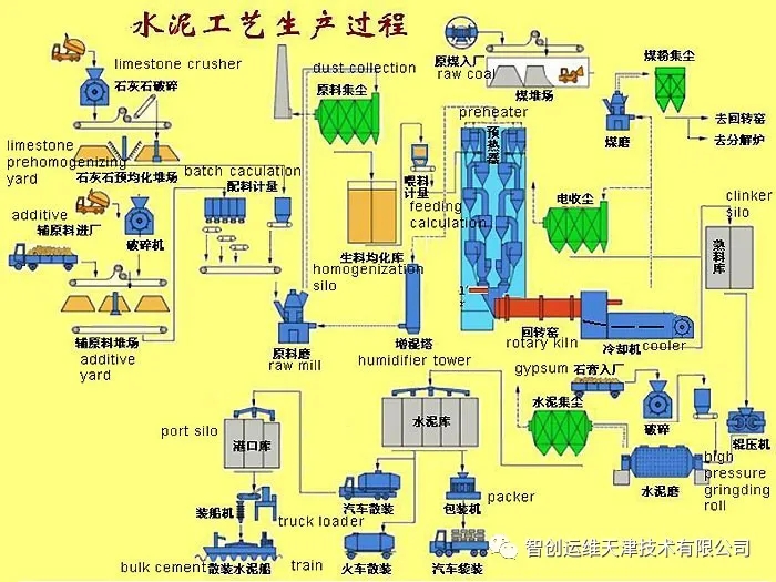 4.生產(chǎn)工藝:硅酸鹽水泥生產(chǎn)的大體步驟是:先把幾種原材料按適當(dāng)?shù)谋壤浜虾煤笤谀C(jī)中磨成生料;然后將制得的生料入窯進(jìn)行煅燒;再把燒好的熟料配以適當(dāng)?shù)氖啵ê突旌喜牧希┰谀C(jī)中磨成細(xì)粉,即得水泥。硅酸鹽系水泥的生產(chǎn)概括起來(lái)就是“兩磨一燒”。生料制備:石灰質(zhì)原料,粘土質(zhì)原料與少量校正原料經(jīng)破碎后,按一定比例配合、磨細(xì),并配合為成分合適,質(zhì)量均勻的生料熟料煅燒:生料在水泥窯內(nèi)煅燒至部分熔融所得以硅酸鈣為主要成分的硅酸鹽水泥熟料水泥粉磨:熟料加適量石膏,有時(shí)還加適量混合材料或外加劑共同磨細(xì)為水泥生產(chǎn)方法①干法生產(chǎn) 將原料同時(shí)烘干并粉磨,或先烘干經(jīng)粉磨成生料粉后喂入干法窯內(nèi)煅燒成熟料的方法。但也有將生料粉加入適量水制成生料球,送入立波爾窯內(nèi)煅燒成熟料的方法,稱之為半干法,仍屬干法生產(chǎn)之一種。②濕法生產(chǎn) 將原料加水粉磨成生料漿后,喂入濕法窯煅燒成熟料的方法。也有將濕法制備的生料漿脫水后,制成生料塊入窯煅燒成熟料的方法,稱為半濕法,仍屬濕法生產(chǎn)之一種。 干法和濕法生產(chǎn)特點(diǎn)①干法生產(chǎn)特點(diǎn):干法是將生料粉直接送入窯內(nèi)煅燒,入窯生料的含水率一般僅1%~2%,省去了烘干生料所需的大量熱量。不僅可以制備出質(zhì)量均勻的生料而且逐步向大型方向發(fā)展?,F(xiàn)在將懸浮預(yù)熱和預(yù)分解窯統(tǒng)稱為新型干法窯,它們成為干法生產(chǎn)今后發(fā)展的方向。②濕法生產(chǎn)特點(diǎn):將生料制成含水32%一36%的料漿,在回轉(zhuǎn)窯內(nèi)將生料漿烘干并燒成熟料。濕法制備料漿,粉磨能耗較低,約低30%,料漿容易混勻,生料成分穩(wěn)定,有利于燒出高質(zhì)量的熟料。但球磨機(jī)易磨件的鋼材消耗大,熟料出窯溫度較低,不宜燒高硅酸率和高鋁氧率的熟料。