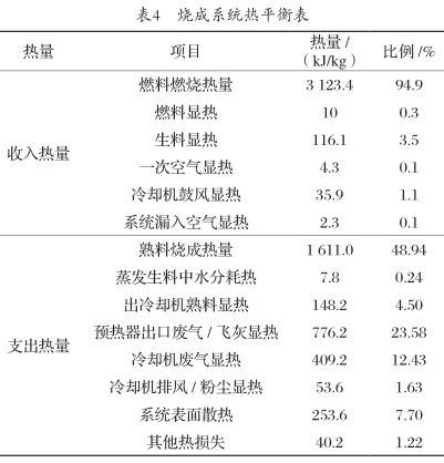 水泥窯系統熱平衡范圍主要包括燒成和冷卻機系統,對該企業水泥窯系統的熱平衡進行測試,系統熱量收支平衡如表4所示。