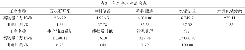 水泥企業電力消耗主要是設備動力拖動,一部分由社會電網提供,另外一部分由企業余熱發電廠提供。2018年企業外購電力13 688.15 萬kWh,余熱自發電4 112.77 萬kWh,合計17 800.92 萬kWh全部用于水泥生產。各工序用電流向如表2所示。