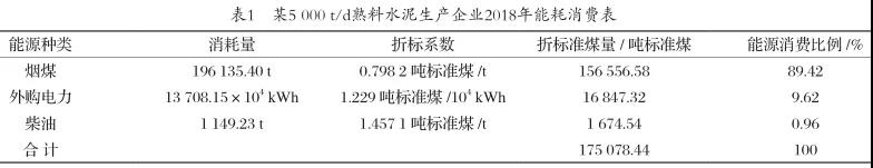 某水泥企業,現有1條5000t/d新型干法水泥回轉窯生產線以及2臺180t/h水泥磨,具有年產普通硅酸鹽水泥熟料150萬t和年產硅酸鹽水泥160萬t的生產能力。主要產品為PO42.5和PS32.5A水泥。主要消耗的能源為煙煤、電力、柴油等。主要生產工序包括石灰石礦山開采、生料制備、熟料煅燒、水泥制成。2018年該企業綜合能耗為175078.44噸標準煤。主要能源消費情況如表1所示。
