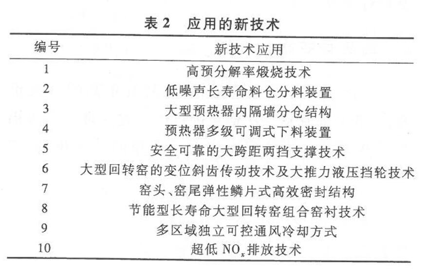 通過多年的自主研發(fā)和實踐經(jīng)驗積累,我公司在本工程上應(yīng)用了大量的回轉(zhuǎn)窯新技術(shù),確保回轉(zhuǎn)窯系統(tǒng)的節(jié)能、環(huán)保、高效。具體應(yīng)用的新技術(shù)列于表2。