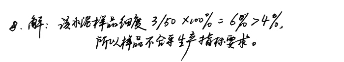 8、某廠水泥樣品50g,經0.08mm方孔篩篩析,達到規定時間所剩料量為3g,問該樣品是否合乎生產指標要求?(要求水泥細度<4%)