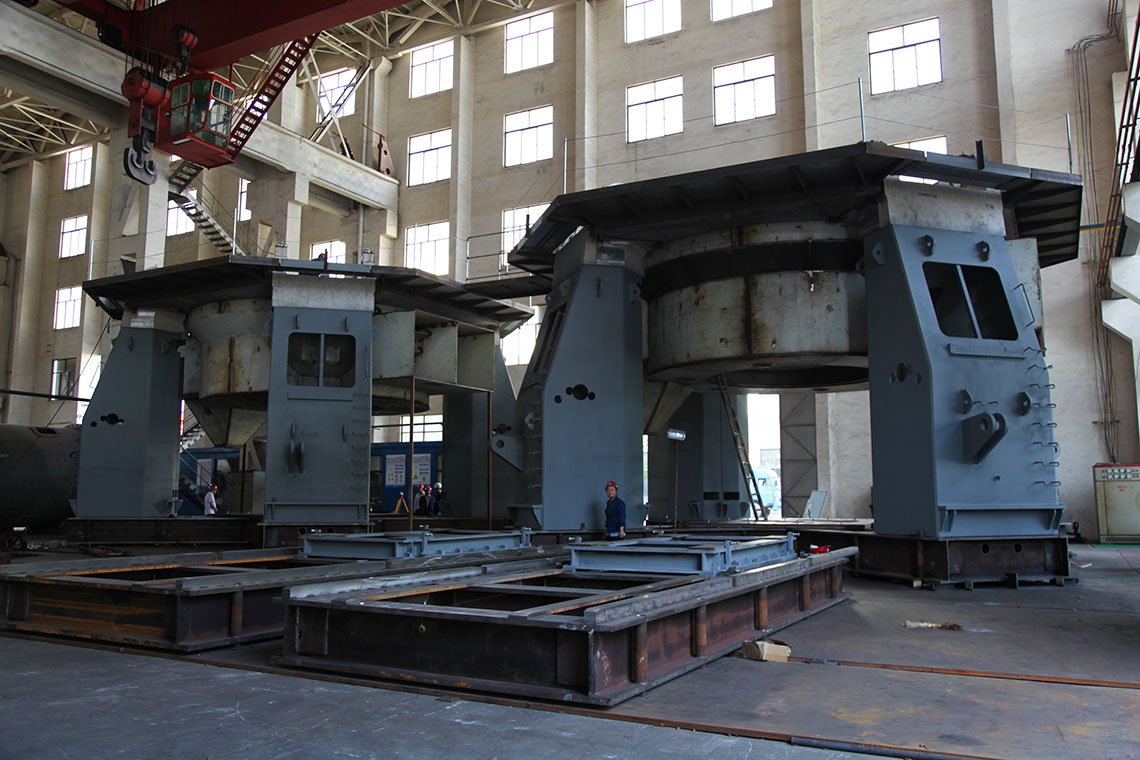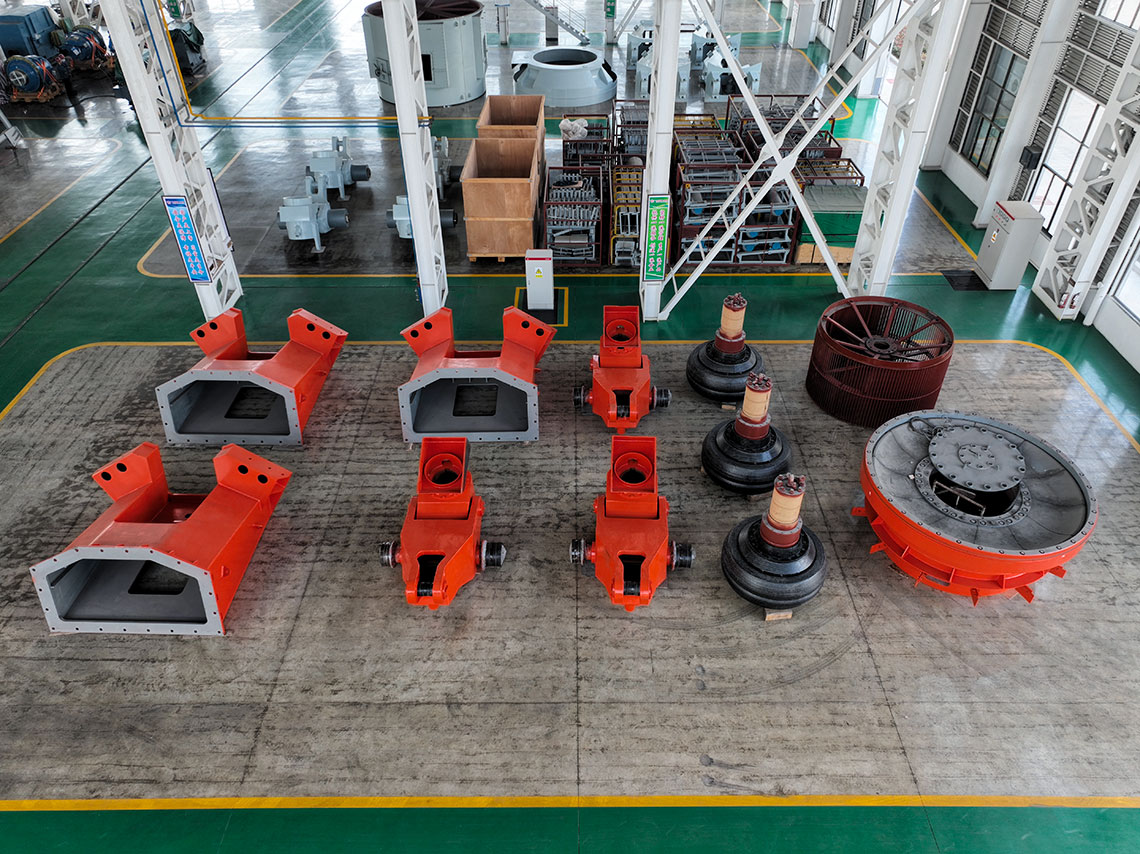 磨煤機(jī)三個(gè)磨輥由旋轉(zhuǎn)的磨盤帶動(dòng)進(jìn)行碾磨作業(yè)。入磨物料經(jīng)中心落煤管落在磨盤上后,由旋轉(zhuǎn)磨盤產(chǎn)生的離心力將其輸送至碾磨輥道上碾磨。碾磨壓力由彈簧或液壓加壓裝置產(chǎn)生,通過靜定的三點(diǎn)系統(tǒng),碾磨力均勻地傳至三個(gè)磨輥,通過加壓系統(tǒng)壓力傳至基礎(chǔ)。煤粉的干燥和輸送利用熱風(fēng)來進(jìn)行。熱風(fēng)通過噴嘴環(huán)均勻分布于磨盤四周,將經(jīng)碾磨的物料干燥并輸送至磨機(jī)上部的分離器。物料的粗細(xì)粉在此分離,細(xì)粉排出磨機(jī),粗粉重新返回磨內(nèi)碾磨。物料中的一些不可破碎物可通過磨機(jī)下部的排碴口排出。磨煤機(jī)主要由基礎(chǔ)部,減速機(jī),下架機(jī),中架機(jī),磨盤,磨輥,加壓裝置,分離器,正壓風(fēng)密封裝置,蒸汽吹掃裝置等部件組成,還配有主電動(dòng)機(jī),潤(rùn)滑油站,液壓站和密封風(fēng)機(jī)等附屬設(shè)備,另備有慢速傳動(dòng)裝置,安裝檢修專用工具,扶梯平臺(tái),煤粉分配器,速斷閥等配套設(shè)備供用戶選用。磨煤機(jī)采用液壓加壓系統(tǒng),在運(yùn)行中即可對(duì)粉磨壓力進(jìn)行調(diào)整,并具有更好的過鐵保護(hù)性能。在原標(biāo)準(zhǔn)型的基礎(chǔ)上增加了磨輥翻出裝置,并提高了磨體的抗爆能力。